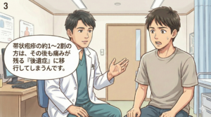 通常、皮膚の症状は2〜4週間で治まります。しかし、神経の損傷がひどい場合、皮膚が完治した後も、刺すような、あるいは焼けるような激痛が数ヶ月から数年以上続くことがあります。これが帯状疱疹後神経痛です。