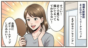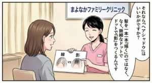 相模大野駅前 まよなかファミリークリニックでは、医師の管理のもと、昼間の時間帯に安全で丁寧なアートメイク施術を行っております。当院ではこのたび、頭皮に微細なドットで”ふわっと影をつくり、錯視効果によって髪がボリュームアップしたように見せる技法の頭皮アートメイク「ヘアシャドウ」を導入しました。