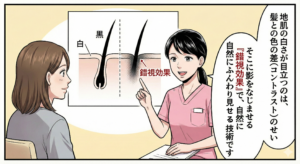 実際には、地肌と髪の色の差や光が当たったときの反射、頭皮が白く見えることで生じる”透け感”など これらが重なることで、「薄く見える」印象が生まれます。
